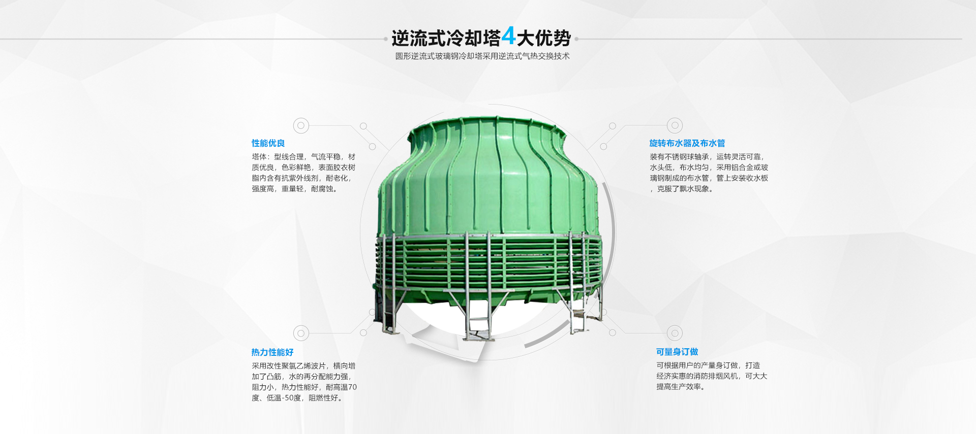 圓形冷卻塔-圓形逆流式閉式冷卻塔里面填料是PVC淋水片,以擴散淋水面積,利用旋轉(zhuǎn)布水形式,實現(xiàn)布水均勻,以加強到冷卻的效果,···